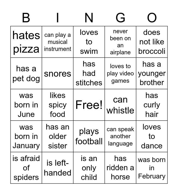 This bingo card has a free space and 33 words: enjoys maths, has seen a snake in the wild, likes spicy food, bites his/her fingernails, was born in January, snores, does not like broccoli, is afraid of spiders, can play a musical instrument, has fainted or thrown up in public, has had stitches, loves to swim, who has more than four siblings, can use chopsticks, can whistle, has a younger brother, is left-handed, was born in June, has an older sister, can speak another language, plays football, loves macaroni & cheese, hates pizza, has curly hair, is an only child, was born in February, never been on an airplane, loves to play video games, has a pet dog, loves to dance, has a pet cat, has ridden a horse and plays a musical instrument.