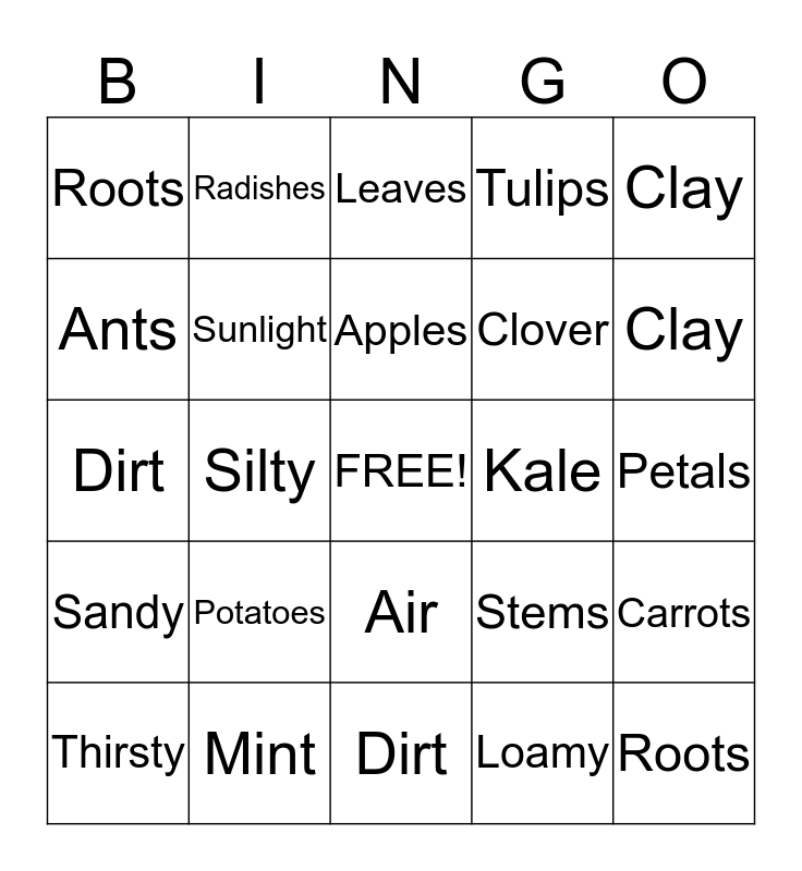 This bingo card has a free space and 29 words: Thirsty, Nutrients, Silty, Loamy, Roots, Leaves, Sunlight, Potatoes, Kale, Mint, Petals, Roots, Dirt, Loamy, Clay, Soil, Air, Sandy, Clay, Dirt, Stems, Flowers, Clover, Ants, Tulips, Radishes, Carrots, Apples and Compost.