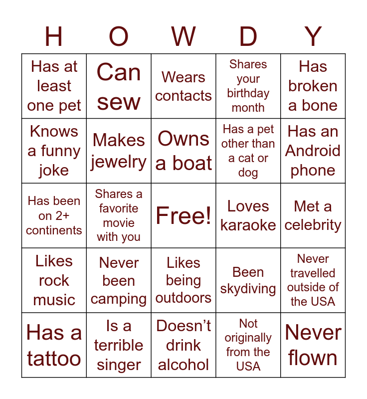 This bingo card has a free space and 71 words: Bites their fingernails, Can sew, Crochets/knits, Doesn’t drink coffee, Doesn’t drink alcohol, Had braces, Shares your birthday month, Has a friend from another culture, Has a pet other than a cat or dog, Has a pool, Has a tattoo, Has a twin, Has an Android phone, Has at least one pet, Has been at the CVMBS for 3+ years, Has been on 2+ continents, Been skydiving, Has broken a bone, Lived in BCS for more than 5 years, Met a celebrity, Never been camping, Never flown, Never travelled outside of the USA, Officiated a Wedding, Has ridden a horse, Runs marathon(s), Has season tickets to their favorite sports team, Has 2+ siblings, Worked at Texas A&M for 5+ years, Hates to exercise, Is a terrible singer, Is a vegetarian or vegan, Is a Veteran, Is an only child, Not originally from the USA, Is older than you, Is younger than you, Is/was a first-gen student, Knows a funny joke, Lifts weights, Likes being outdoors, Likes classical music, Likes rock music, Likes sushi, Likes to cook, Likes to paint, Likes to fish/hunt, Makes jewelry, Likes to play video games, Listens to hip hop/rap music (regularly), Lives outside of BCS, Loves amusement parks, Loves karaoke, Loves snow, Loves to dance, Loves to exercise, Owns a boat, Plays a musical instrument, Practices/has practiced a team sport, Reads comic books, Scuba dives, Shares a favorite TV show with you, Shares a favorite movie with you, Speaks 2+ languages, Surfs, Wears a retainer at night, Wears contacts, Wears glasses, Doesn’t have social media, Writes stories/poetry and Dyes hair.