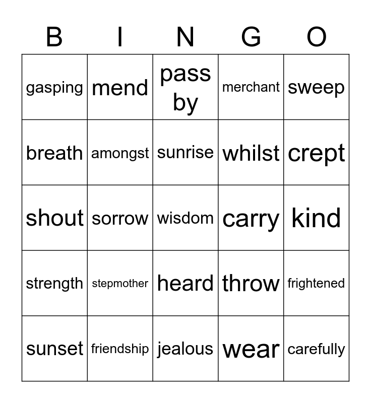 This bingo card has 25 words: stepmother, jealous, sunrise, sunset, sweep, gasping, breath, mend, carry, heard, whilst, shout, throw, frightened, amongst, carefully, kind, pass by, crept, sorrow, wisdom, friendship, strength, merchant and wear.