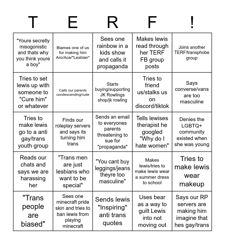 This bingo card has a free space and 24 words: "Trans men are just lesbians who want to be special", Sees one minecraft pride skin and tries to ban lewis from playing minecraft, Starts buying/supporting JK Rowlings shop/jk rowling, "Trans people are biased", Joins another TERF/transphobe group, "Youre secretly misogonistic and thats why you think youre a boy", Tries to set lewis up with someone to "Cure him" or whatever, Blames one of us for making him Aro/Ace/"Lesbian", Tells lewises therapist he googled "Why do I hate women", "You cant buy leggings/jeans theyre too masculine", Tries to friend us/stalks us on discord/tiktok, Tries to make lewis go to a anti gay/trans youth group, Makes lewis/tries to make lewis wear a summer dress to school, Tries to make lewis wear makeup, Calls our parents condescending/rude, Uses bear as a way to guilt Lewis into not moving out, Denies the LGBTQ+ community existed when she was young, Sees one rainbow in a kids show and calls it propaganda, Says converse/vans are too masculine, Finds our roleplay servers and says its turning him trans, Says our RP servers are making him imagine that hes gay/trans, Reads our chats and says we are harassing her, Makes lewis read through her TERF FB group posts and Sends lewis "Inspiring" anti trans quotes.