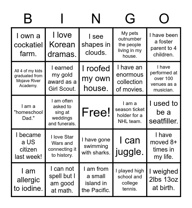 This bingo card has a free space and 29 words: I am allergic to iodine., I have a total of 11 siblings., I am often asked to sing at weddings and funerals., I enjoy hiking in the Big Bear area., I own a cockatiel farm., I see shapes in clouds., I earned my gold award as a Girl Scout., I love Star Wars and connecting it to history., I am a season ticket holder for a NHL team., I can not spell but I am good at math., I used to be a seatfiller., I weighed 2lbs 13oz at birth., I am from a small island in the Pacific., I played high school and college tennis., I have performed at over 100 venues as a musician., My car has no air conditioning., I have gone swimming with sharks., I became a US citizen last week!, I have been a foster parent to 4 children., I am a "homeschool Dad.", I can juggle., I traveled to China during college., I have an enormous collection of movies., All 4 of my kids graduated from Mojave River Academy., My pets outnumber the people living in my house., I love Korean dramas., I have moved 8+ times in my life., I roofed my own house. and I was a hairstylist for 14 years before I started teaching..