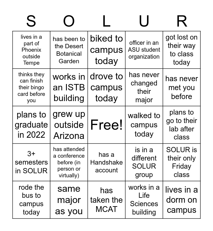 This bingo card has a free space and 58 words: online student, same major as you, first semester in SOLUR, 3+ semesters in SOLUR, works in a Life Sciences building, works in Biodesign, works in an ISTB building, has changed their major at least once, has never changed their major, has a major and at least one minor, officer in an ASU student organization, has worked in their research lab for ≥2 years, primarily conducts dry lab research, primarily conducts wet lab research, lives in Tempe, lives in a part of Phoenix outside Tempe, lives in a dorm on campus, got lost on their way to class today, slept through more than one alarm this morning, drove to campus today, walked to campus today, biked to campus today, rode the bus to campus today, SOLUR is their only Friday class, went to their lab before class today, plans to go to their lab after class, watched at least one event in the 2021 Olympics, has a pet, has never met you before, is a SOLUR Fellow, is a SOLUR Scholar, is a SOLUR Reseacher, is a SOLUR Apprentice, wants to go to medical school, wants to go to graduate school, wants to work in industry, grew up in Arizona, grew up outside Arizona, plans to graduate in 2022, has presented a scientific poster before, has attended a conference before (in person or virtually), is in your SOLUR group, is in a different SOLUR group, is a microbiology/ med micro major, is a neuroscience major, is a biological sciences major, has a Linkedin account, has a Handshake account, has taken the MCAT, has kept a houseplant alive for over a year, is in or has had a class (besides SOLUR) with you, has not cut their hair in over 6 months, wanted to be a veterinarian when they were a kid, has been to the Phoenix Zoo, has been to the Desert Botanical Garden, is taking >14 credits this semester, thinks they can finish their bingo card before you and works with a 'model organism'.
