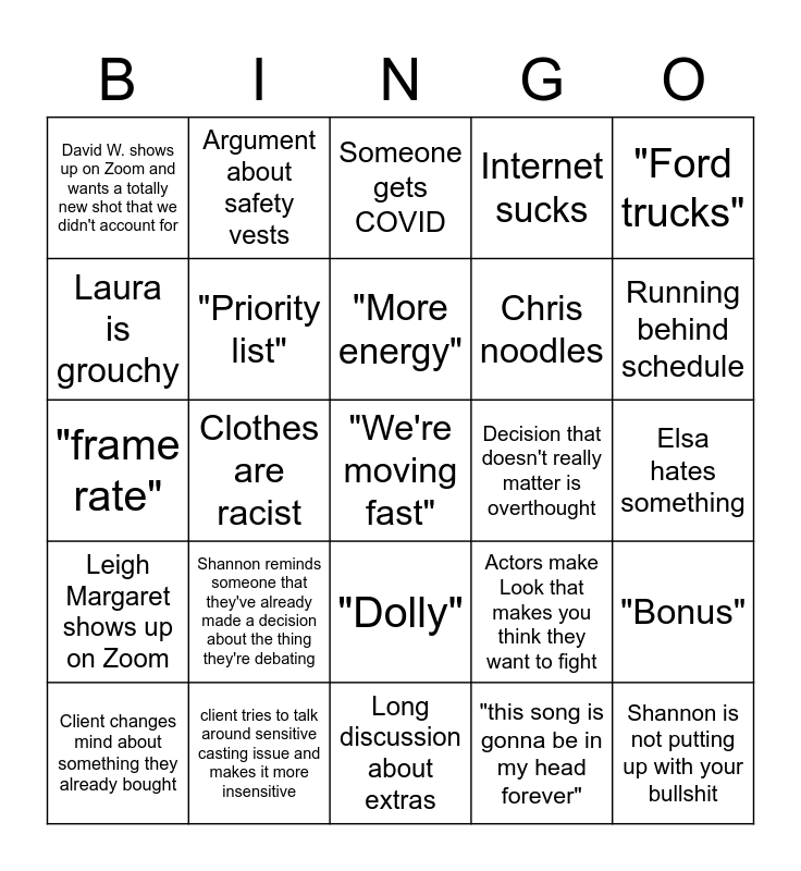 This bingo card has a free space and 39 words: "We need to move on", "ADR", Lorraine asks question about lighting, "Priority list", Client changes mind about something they already bought, "Dolly", "More energy", "Throw it away", "Ford trucks", Leigh Margaret shows up on Zoom, Clothes are racist, Internet sucks, Shannon is not putting up with your bullshit, Elsa hates something, Decision that doesn't really matter is overthought, Shannon reminds someone that they've already made a decision about the thing they're debating, Spend a disproportionate amount of time on The Look, David W. shows up on Zoom and wants a totally new shot that we didn't account for, Ben says "I love that", Actors make Look that makes you think they want to fight, Laura is grouchy, Long discussion about extras, Chris noodles, Running behind schedule, Client provides a pun as a wild line, Spend a disproportionate time on capturing blank phone screens, Slate is grouchy but professional, Fish isn't gross enough, Fish is too gross, Argument about safety vests, someone complains about the color on the monitor, Vishal dials in from the Decoded office, Someone gets COVID, client tries to talk around sensitive casting issue and makes it more insensitive, "this song is gonna be in my head forever", Katie looks into Zoom in a way that makes it seem like she's silently judging you, "Bonus", "frame rate" and "play it back".