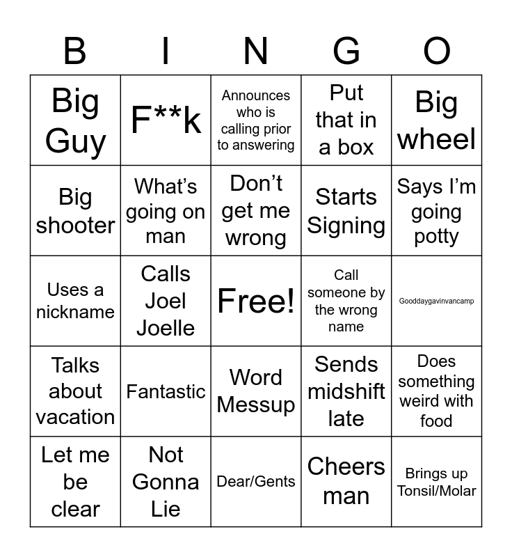 This bingo card has a free space and 24 words: Fantastic, Not Gonna Lie, Don’t get me wrong, Let me be clear, Big wheel, Big Guy, Big shooter, F**k, Call someone by the wrong name, Word Messup, Starts Signing, Uses a nickname, Sends midshift late, Does something weird with food, What’s going on man, Cheers man, Gooddaygavinvancamp, Announces who is calling prior to answering, Says I’m going potty, Calls Joel Joelle, Brings up Tonsil/Molar, Talks about vacation, Put that in a box and Dear/Gents.