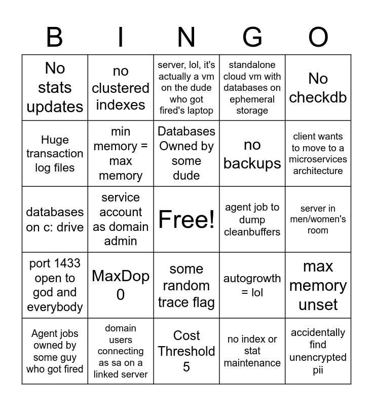 This bingo card has a free space and 25 words: MaxDop 0, Cost Threshold 5, Databases Owned by some dude, Agent jobs owned by some guy who got fired, No checkdb, No stats updates, Huge transaction log files, no clustered indexes, agent job to dump cleanbuffers, some random trace flag, no backups, databases on c: drive, autogrowth = lol, max memory unset, min memory = max memory, this is actually a VM on a completely overallocated host, server in men/women's room, server, lol, it's actually a vm on the dude who got fired's laptop, client wants to move to a microservices architecture, service account as domain admin, accidentally find unencrypted pii, domain users connecting as sa on a linked server, port 1433 open to god and everybody, standalone cloud vm with databases on ephemeral storage and no index or stat maintenance.