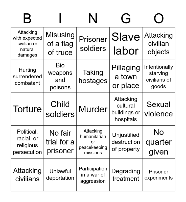 This bingo card has a free space and 24 words: No fair trial for a prisoner, Unlawful deportation, Taking hostages, Attacking civilians, Attacking civilian objects, Attacking with expected civilian or natural damages, Hurting surrendered combatant, Misusing of a flag of truce, Attacking cultural buildings or hospitals, Attacking humanitarian or peacekeeping missions, Pillaging a town or place, Torture, Unjustified destruction of property, No quarter given, Bio weapons and poisons, Degrading treatment, Sexual violence, Prisoner soldiers, Intentionally starving civilians of goods, Child soldiers, Prisoner experiments, Political, racial, or religious persecution, Slave labor and Participation in a war of aggression.