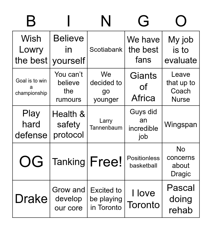 This bingo card has 26 words: Free!, I love Toronto, We decided to go younger, Grow and develop our core, My job is to evaluate, Wish Lowry the best, Goal is to win a championship, Believe in yourself, Wingspan, Positionless basketball, Giants of Africa, Play hard defense, No concerns about Dragic, Drake, Health & safety protocol, Raptors basketball, We have the best fans, OG, Scotiabank, Larry Tannenbaum, Leave that up to Coach Nurse, Excited to be playing in Toronto, Guys did an incredible job, Tanking, You can’t believe the rumours and Pascal doing rehab.
