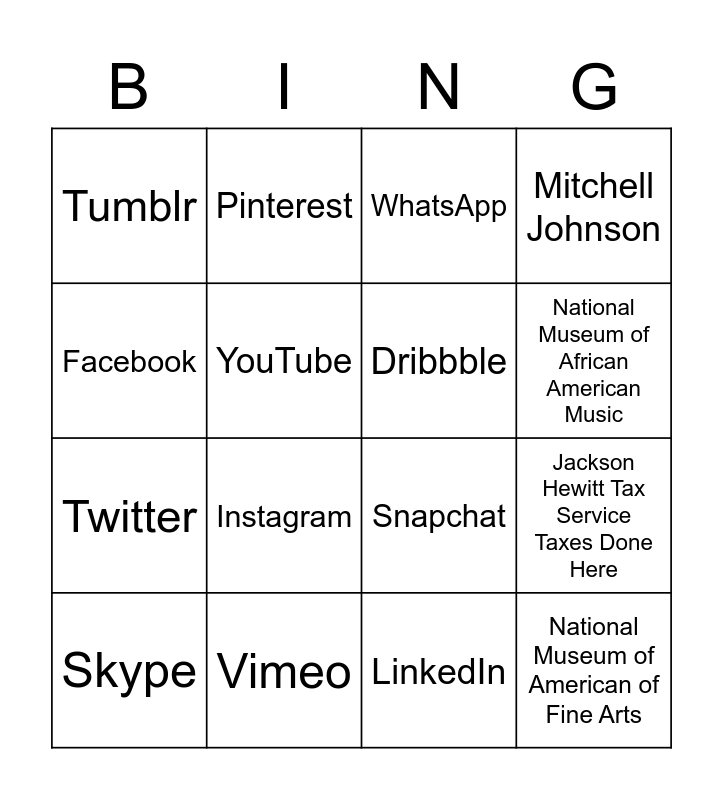 This bingo card has 16 words: Skype, Vimeo, WhatsApp, Mitchell Johnson, Facebook, Pinterest, Snapchat, Jackson Hewitt Tax Service Taxes Done Here, Tumblr, YouTube, LinkedIn, National Museum of African American Music, Twitter, Instagram, Dribbble and National Museum of American of Fine Arts.