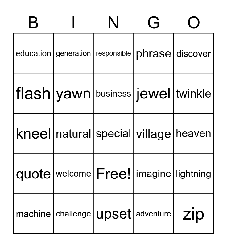 This bingo card has 26 words: Free!, adventure, business, challenge, discover, education, flash, generation, heaven, imagine, jewel, kneel, lightning, machine, natural, opposite, phrase, quote, responsible, special, twinkle, upset, village, welcome, yawn and zip.