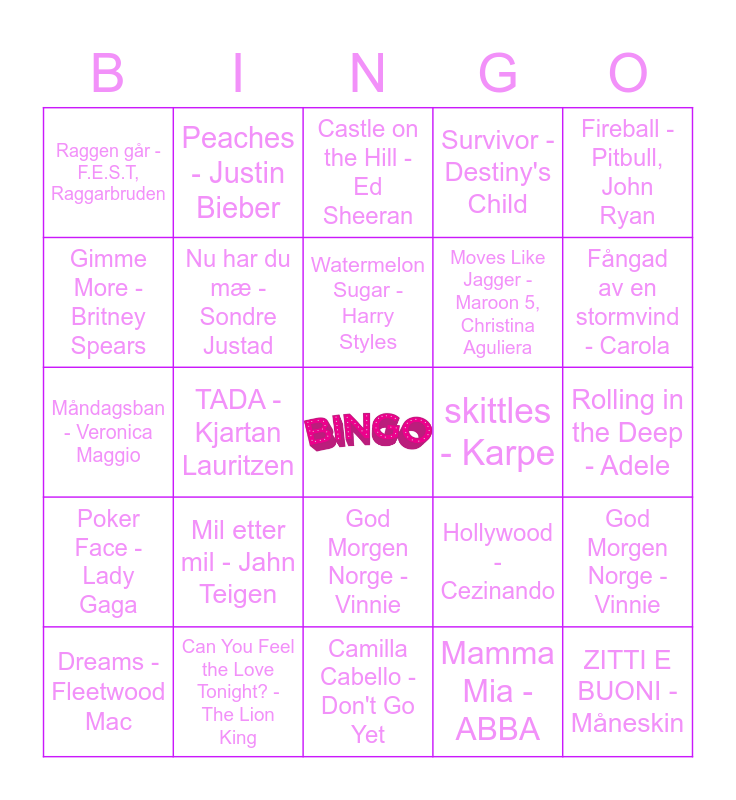 ⚠ This card has duplicate items: Levitating - Dua Lipa, DaBaby (2), Serotonin - girl in red (2), Fireball - Pitbull, John Ryan (2), Grenade - Bruno Mars (2), Rolling in the Deep - Adele (2), TADA - Kjartan Lauritzen (2), Can You Feel the Love Tonight? - The Lion King (2), September -Earth, Wind & Fire (2), Summertime Sadness - Lana Del Rey (2), New Light - John Mayer (2), My Kind of Woman - Mac deMarco (2), Cover Me In Sunshine - P!nk, Willow Sage Hart (2), Another Brick In The Wall - Pink Floyd (2), Nu har du mæ - Sondre Justad (2), All of Me - John Legend (2), City Of Stars - Ryan Gosling, Emma Stone (2), Poker Face - Lady Gaga (2), YMCA - Village People (2), Rocket Man - Elton John (2), Øynene lukket - Lars Vaular, Sondre Lerche (2), skittles - Karpe (2), I Wanna Dance with Somebody - Whitney Houston (2), Watermelon Sugar - Harry Styles (2), Wake Me Up Before You Go-Go (2), The Best of Both Worlds - Hannah Montana (2), Fångad av en stormvind - Carola (2), Survivor - Destiny's Child (2), Mil etter mil - Jahn Teigen (2), Hollywood - Cezinando (2), Save Your Tears - The Weeknd (2), Peaches - Justin Bieber (2), Castle on the Hill - Ed Sheeran (2), Camilla Cabello - Don't Go Yet (2), Raggen går - F.E.S.T, Raggarbruden (2), 5 fine frøkner - Gabrielle (2), God Morgen Norge - Vinnie (2), Tiktok - Kesha (2), Snakke Litt - Admiral P (2), Måndagsban - Veronica Maggio (2)