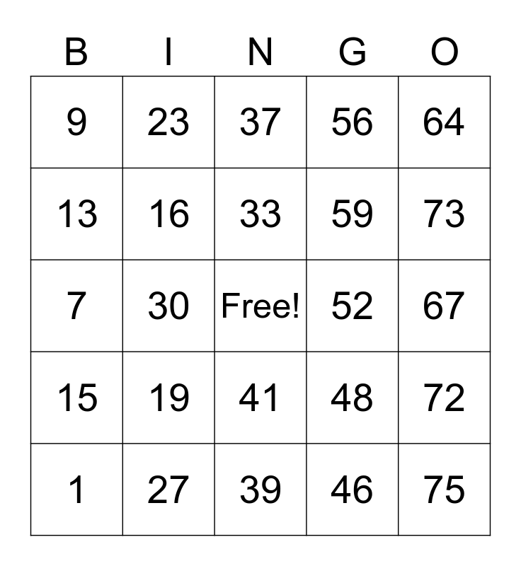 This bingo card has a free space and 24 words: 1, 19, 33, 46, 64, 9, 23, 37, 52, 67, 7, 16, 48, 72, 13, 27, 39, 56, 73, 15, 30, 41, 59 and 75.