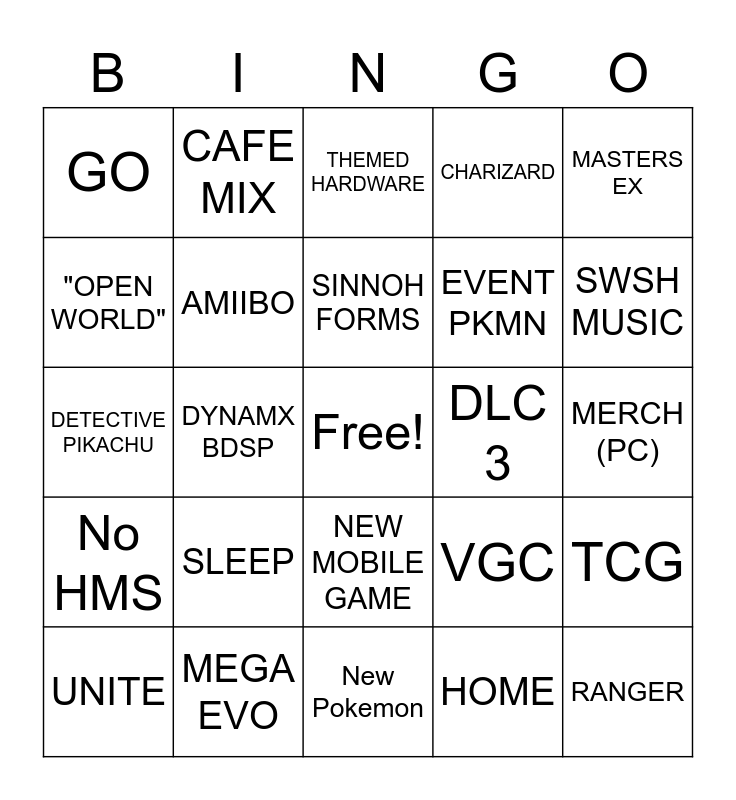 This bingo card has a free space and 24 words: SLEEP, MEGA EVO, SINNOH FORMS, UNITE, MASTERS EX, GO, "OPEN WORLD", CAFE MIX, DLC 3, NEW MOBILE GAME, EVENT PKMN, DETECTIVE PIKACHU, VGC, TCG, AMIIBO, HOME, MERCH (PC), THEMED HARDWARE, SWSH MUSIC, DYNAMX BDSP, RANGER, No HMS, CHARIZARD and New Pokemon.