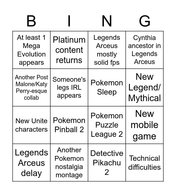 This bingo card has 16 words: Another Pokemon nostalgia montage, New mobile game, Legends Arceus mostly solid fps, At least 1 Mega Evolution appears, New Unite characters, Platinum content returns, Pokemon Puzzle League 2, Detective Pikachu 2, Another Post Malone/Katy Perry-esque collab, Someone's legs IRL appears, Legends Arceus delay, Cynthia ancestor in Legends Arceus, Pokemon Pinball 2, New Legend/ Mythical, Pokemon Sleep and Technical difficulties.