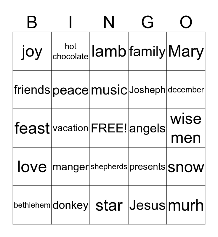 This bingo card has a free space and 24 words: manger, donkey, music, bethlehem, Mary, joy, friends, hot chocolate, angels, shepherds, Josheph, feast, presents, snow, peace, Jesus, wise men, lamb, december, vacation, murh, love, family and star.