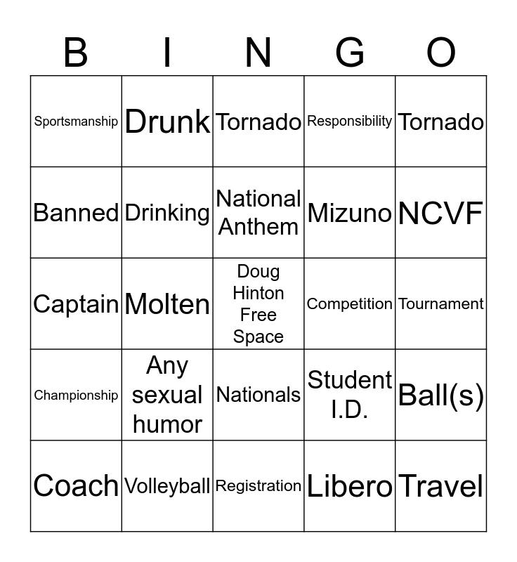 This bingo card has a free space and 27 words: Student I.D., Nationals, Mizuno, Registration, Banned, Tornado, Drunk, Championship, Competition, Ball(s), Captain, Responsibility, Coach, Volleyball, NCVF, Courts, Drinking, National Anthem, Any sexual humor, Sportsmanship, Tournament, Libero, Molten, Travel, Nationals, Tornado and Drunk.