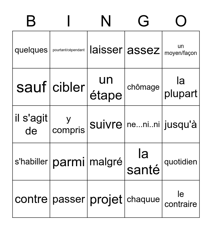 This bingo card has 25 words: parmi, projet, un étape, contre, un moyen/façon, quelques, sauf, pourtant/cépendant, ne...ni..ni, malgré, chômage, il s'agit de, la santé, quotidien, cibler, le contraire, jusqu'à, laisser, la plupart, y compris, suivre, passer, s'habiller, assez and chaquue.
