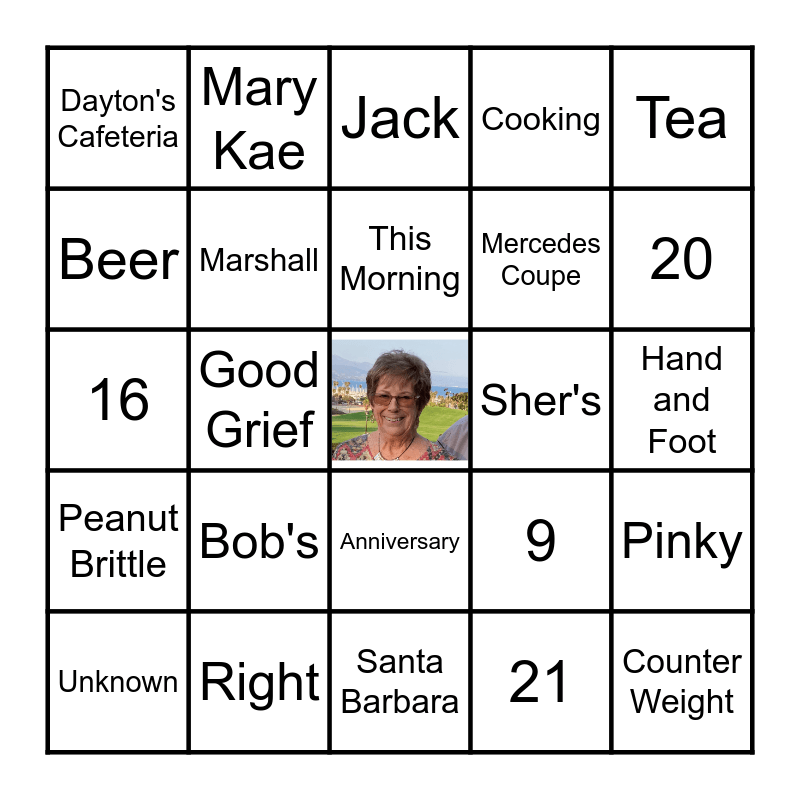 This bingo card has a free space and 29 words: Unknown, St. Benedict's, Good Grief, Donna Harr, Dayton's Cafeteria, Jack, Marshall, Bob's, Sher's, Right, Hand and Foot, Counter Weight, Santa Barbara, 21, 20, Pearl, Anniversary, Peanut Brittle, Tea, 16, 9, Dollar Coins, Mercedes Coupe, Beer, Cooking, Mary Kae, Pinky, This Morning and Left.
