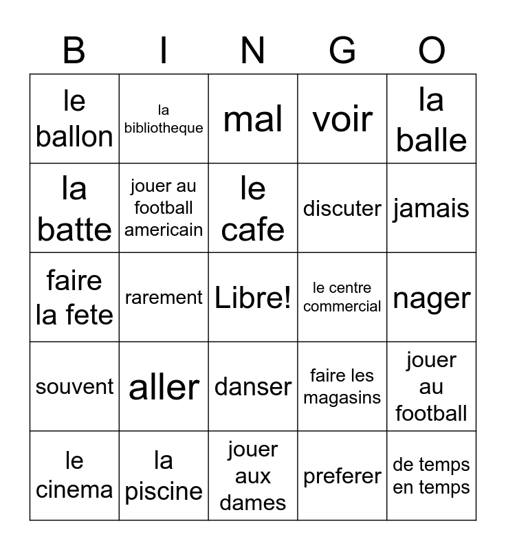 This bingo card has a free space and 24 words: aller, la piscine, le cafe, le cinema, la balle, le ballon, la batte, la bibliotheque, le centre commercial, danser, discuter, faire la fete, faire les magasins, jouer au football, jouer au football americain, preferer, nager, mal, jamais, rarement, de temps en temps, souvent, voir and jouer aux dames.