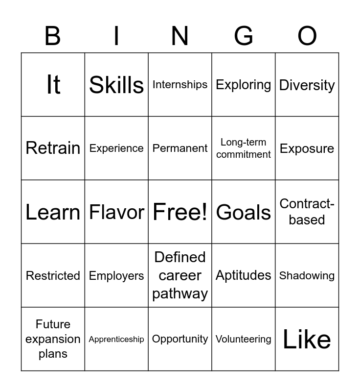 This bingo card has a free space and 24 words: Employers, Apprenticeship, Permanent, Future expansion plans, Diversity, It, Retrain, Skills, Goals, Defined career pathway, Long-term commitment, Learn, Aptitudes, Shadowing, Experience, Volunteering, Contract-based, Internships, Exposure, Flavor, Like, Restricted, Exploring and Opportunity.