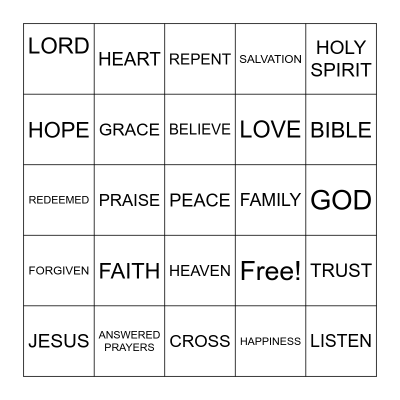 This bingo card has 25 words: FAITH, CROSS, BELIEVE, JESUS, HOLY SPIRIT, LORD, HOPE, HEART, FAMILY, HEAVEN, LOVE, REDEEMED, Free!, TRUST, GRACE, LISTEN, GOD, REPENT, BIBLE, PRAISE, PEACE, ANSWERED PRAYERS, FORGIVEN, SALVATION and HAPPINESS.