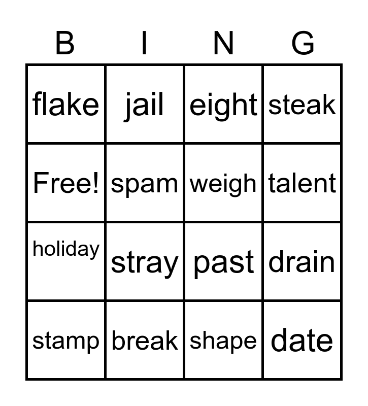 This bingo card has 16 words: break, drain, eight, flake, holiday, jail, past, shape, Free!, spam, stamp, steak, stray, talent, weigh and date.
