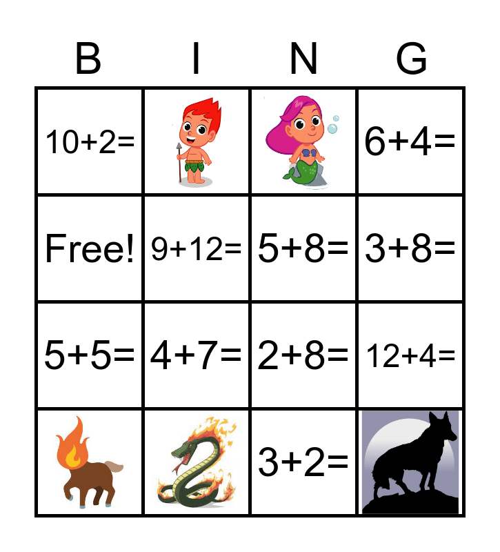 This bingo card has 5 images and 11 words: 12+4=, 10+2=, 5+5=, 2+8=, 3+2=, Free!, 9+12=, 6+4=, 4+7=, 3+8= and 5+8=.