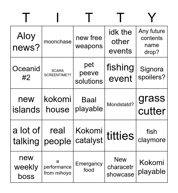 This bingo card has a free space and 24 words: real people, a performance from mihoyo, pet peeve solutions, new weekly boss, Any future contents name drop?, Aloy news?, Oceanid #2, moonchase, Mondstatd?, Kokomi catalyst, fishing event, new islands, titties, fish claymore, SCARA SCREENTIME??, New characetr showcase, grass cutter, new free weapons, Signora spoilers?, kokomi house, Kokomi playable, a lot of talking, idk the other events and Emergancy food.