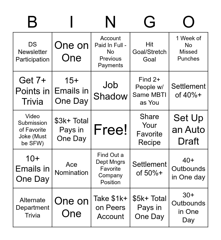 This bingo card has a free space and 24 words: Ace Nomination, One on One, Job Shadow, Alternate Department Trivia, 1 Week of No Missed Punches, DS Newsletter Participation, Get 7+ Points in Trivia, One on One, Share Your Favorite Recipe, Find Out a Dept Mngrs Favorite Company Position, Find 2+ People w/ Same MBTI as You, Video Submission of Favorite Joke (Must be SFW), Settlement of 50%+, 40+ Outbounds in One day, 15+ Emails in One Day, $5k+ Total Pays in One Day, Set Up an Auto Draft, Account Paid In Full - No Previous Payments, Settlement of 40%+, $3k+ Total Pays in One Day, 30+ Outbounds in One Day, 10+ Emails in One Day, Hit Goal/Stretch Goal and Take $1k+ on Peers Account.
