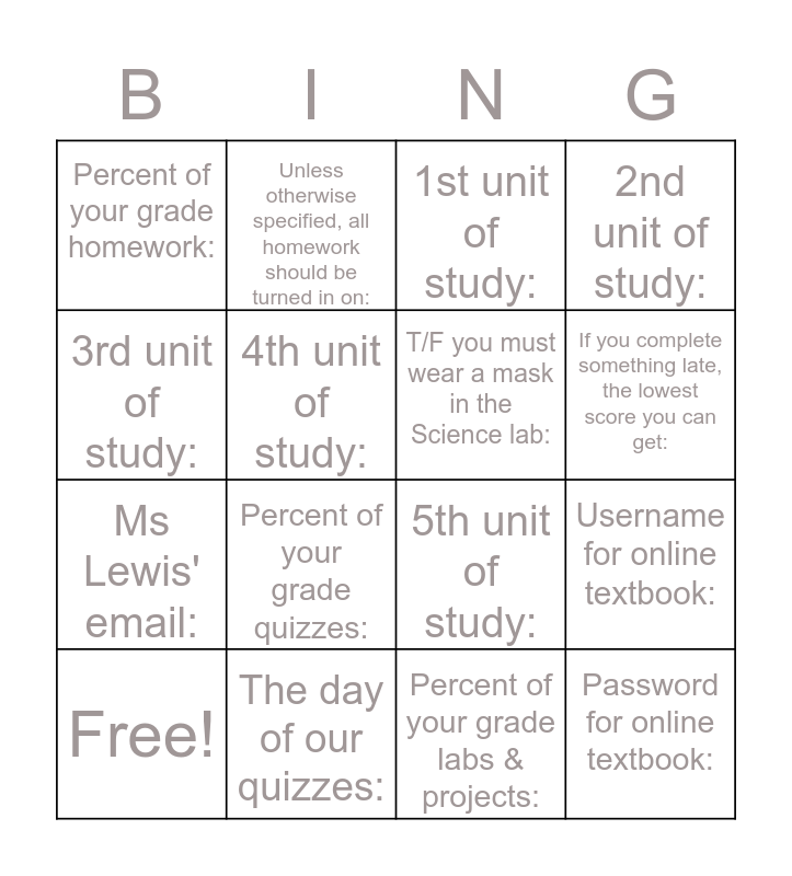 This bingo card has 17 words: Free!, The day of our quizzes:, 1st unit of study:, 2nd unit of study:, Ms Lewis' email:, 4th unit of study:, 5th unit of study:, If you complete something late, the lowest score you can get:, 3rd unit of study:, Percent of your grade quizzes:, Percent of your grade labs & projects:, Username for online textbook:, Percent of your grade homework:, Unless otherwise specified, all homework should be turned in on:, T/F you must wear a mask in the Science lab:, Password for online textbook: and Password for online textbook:.