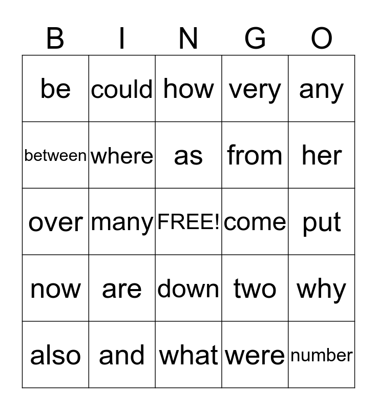 This bingo card has a free space and 24 words: are, and, as, also, any, be, between, could, come, down, from, over, two, why, where, were, put, how, her, many, number, now, very and what.