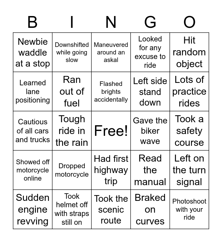 This bingo card has a free space and 24 words: Dropped motorcycle, Took helmet off with straps still on, Flashed brights accidentally, Sudden engine revving, Hit random object, Newbie waddle at a stop, Learned lane positioning, Downshifted while going slow, Gave the biker wave, Had first highway trip, Left side stand down, Cautious of all cars and trucks, Read the manual, Left on the turn signal, Ran out of fuel, Braked on curves, Took a safety course, Maneuvered around an askal, Lots of practice rides, Tough ride in the rain, Photoshoot with your ride, Showed off motorcycle online, Looked for any excuse to ride and Took the scenic route.