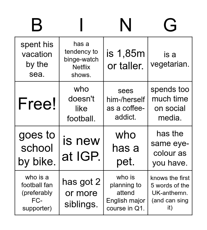 This bingo card has 16 words: has got 2 or more siblings., has the same eye-colour as you have., is 1,85m or taller., spent his vacation by the sea., goes to school by bike., has a tendency to binge-watch Netflix shows., who has a pet., who is planning to attend English major course in Q1., Free!, who doesn't like football., who is a football fan (preferably FC-supporter), is a vegetarian., is new at IGP., spends too much time on social media., sees him-/herself as a coffee-addict. and knows the first 5 words of the UK-anthemn. (and can sing it).
