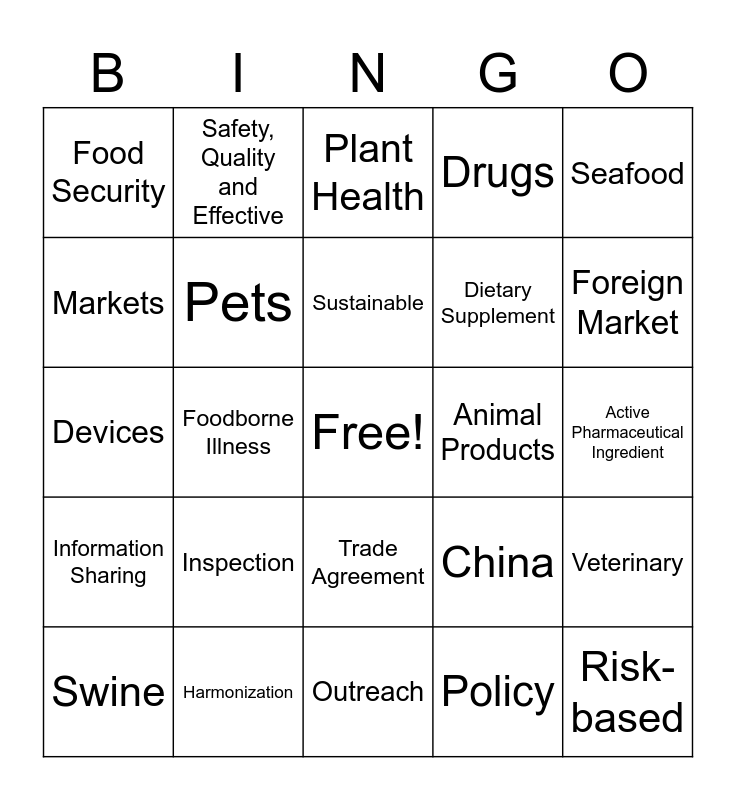 This bingo card has a free space and 25 words: Inspection, Outreach, Sustainable, Swine, Seafood, Food Security, Markets, Safety, Quality and Effective, Animal Products, Trade Agreement, Dietary Supplement, Devices, China, Veterinary, Pets, LACF, Active Pharmaceutical Ingredient, Plant Health, Foreign Market, Foodborne Illness, Risk-based, Harmonization, Information Sharing, Drugs and Policy.