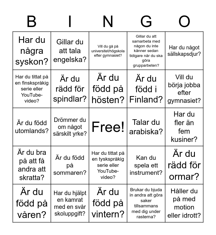 This bingo card has a free space and 25 words: Är du född på sommaren?, Är du född på vintern?, Är du född på hösten?, Är du född på våren?, Har du något sällskapsdjur?, Har du några syskon?, Har du tittat på en finskspråkig serie eller YouTube-video?, Gillar du att tala engelska?, Talar du arabiska?, Har du tittat på en tyskspråkig serie eller YouTube-video?, Är du född i Finland?, Är du född utomlands?, Kan du spela ett instrument?, Är du rädd för ormar?, Är du rädd för spindlar?, Är du mörkrädd?, Har du fler än fem kusiner?, Vill du gå på universitet/högskola efter gymnasiet?, Vill du börja jobba efter gymnasiet?, Drömmer du om något särskilt yrke?, Håller du på med motion eller idrott?, Har du hjälpt en kamrat med en svår skoluppgift?, Är du bra på att få andra att skratta?, Gillar du att samarbeta med någon du inte känner sedan tidigare när du ska göra grupparbeten? and Brukar du bjuda in andra att göra saker tillsammans med dig under rasterna?.