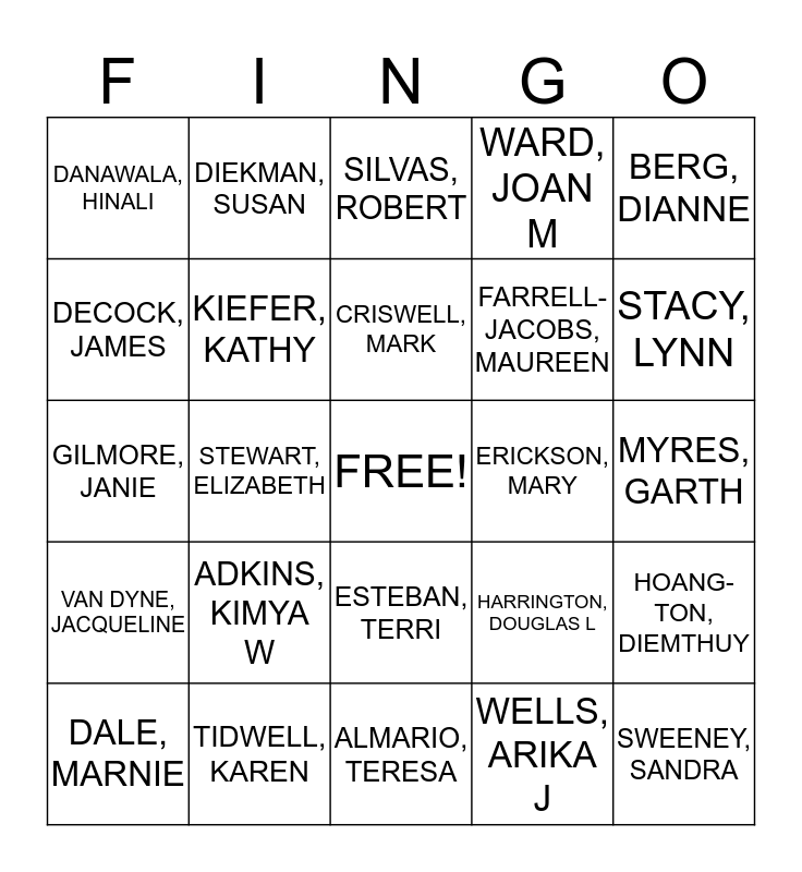 This bingo card has a free space and 25 words: ADKINS, KIMYA W, ALMARIO, TERESA, CRISWELL, MARK, DALE, MARNIE, BERG, DIANNE, DANAWALA, HINALI, DECOCK, JAMES, DIEKMAN, SUSAN, ERICKSON, MARY, ESTEBAN, TERRI, FARRELL-JACOBS, MAUREEN, GILMORE, JANIE, HARRINGTON, DOUGLAS L, HOANG-TON, DIEMTHUY, KIEFER, KATHY, LEINA, YULIYA, MYRES, GARTH, SILVAS, ROBERT, STACY, LYNN, STEWART, ELIZABETH, SWEENEY, SANDRA, TIDWELL, KAREN, VAN DYNE, JACQUELINE, WARD, JOAN M and WELLS, ARIKA J.