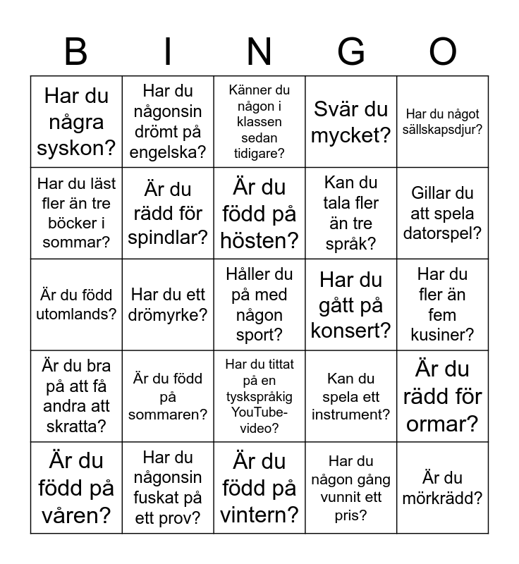 This bingo card has 25 words: Är du född på sommaren?, Är du född på vintern?, Är du född på hösten?, Är du född på våren?, Har du något sällskapsdjur?, Har du några syskon?, Har du läst fler än tre böcker i sommar?, Har du någonsin drömt på engelska?, Har du gått på konsert?, Har du tittat på en tyskspråkig YouTube-video?, Kan du tala fler än tre språk?, Är du född utomlands?, Kan du spela ett instrument?, Är du rädd för ormar?, Är du rädd för spindlar?, Är du mörkrädd?, Har du fler än fem kusiner?, Känner du någon i klassen sedan tidigare?, Gillar du att spela datorspel?, Har du ett drömyrke?, Håller du på med någon sport?, Har du någonsin fuskat på ett prov?, Är du bra på att få andra att skratta?, Svär du mycket? and Har du någon gång vunnit ett pris?.