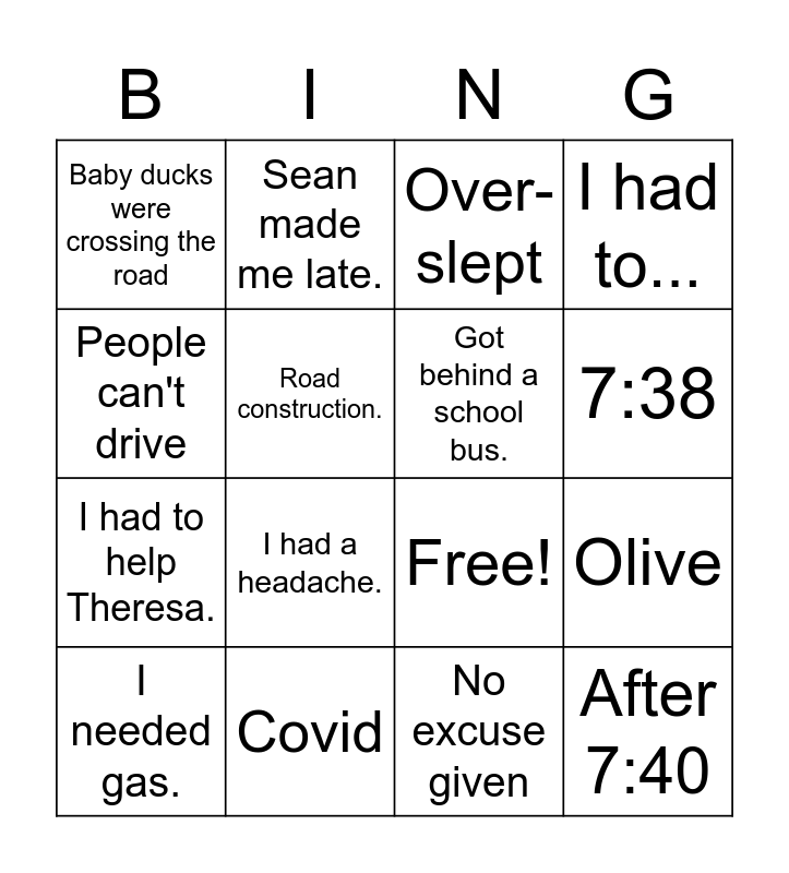 This bingo card has 19 words: Free!, Traffic, Over-slept, After 7:40, Olive, People can't drive, No excuse given, Baby ducks were crossing the road, Sean made me late., I had to help Theresa., I had a headache., Road construction., Got behind a school bus., Covid, I needed gas., After 7:45, I had to..., 7:38 and Aliens abducted me..