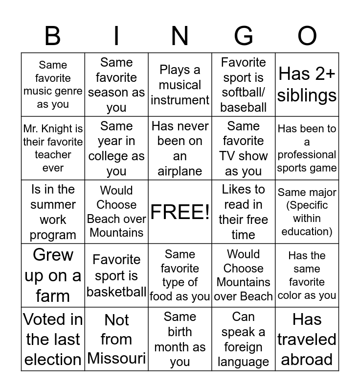 This bingo card has a free space and 24 words: Favorite sport is basketball, Not from Missouri, Has never been on an airplane, Voted in the last election, Has 2+ siblings, Same favorite music genre as you, Mr. Knight is their favorite teacher ever, Same favorite season as you, Likes to read in their free time, Same favorite type of food as you, Same favorite TV show as you, Is in the summer work program, Would Choose Mountains over Beach, Has the same favorite color as you, Same year in college as you, Can speak a foreign language, Same major (Specific within education), Plays a musical instrument, Has been to a professional sports game, Would Choose Beach over Mountains, Has traveled abroad, Grew up on a farm, Favorite sport is softball/ baseball and Same birth month as you.