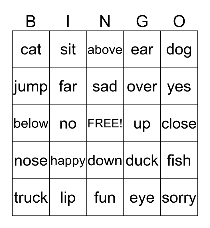 This bingo card has a free space and 25 words: happy, fun, sad, truck, dog, cat, jump, sit, up, down, over, below, duck, fish, far, near, close, above, yes, no, sorry, lip, nose, ear and eye.