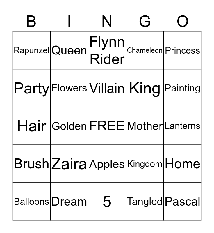 This bingo card has a free space and 30 words: Dream, Crown, Golden, Magic, Rapunzel, Flynn Rider, Flowers, Apples, Mother, 5, Lanterns, Pascal, Tangled, Boat Ride, Painting, Tower, Kingdom, Brush, Zaira, Princess, Hair, Maximus, Queen, King, Party, Chameleon, Home, Balloons, Villain and Snuggly Duckling.