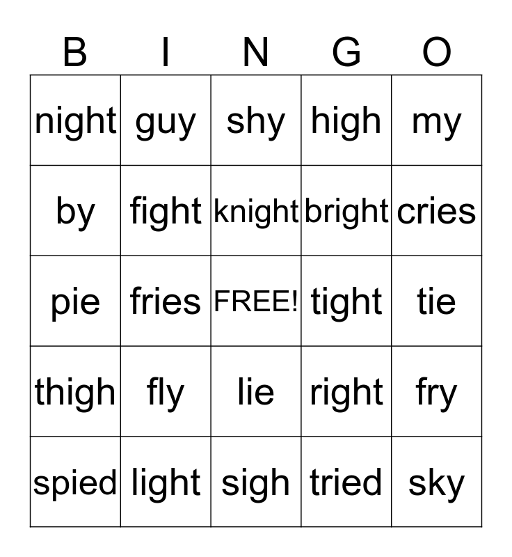 This bingo card has a free space and 24 words: fly, light, knight, spied, my, night, by, guy, tight, lie, bright, pie, right, fry, fight, tried, tie, shy, cries, fries, sky, thigh, high and sigh.