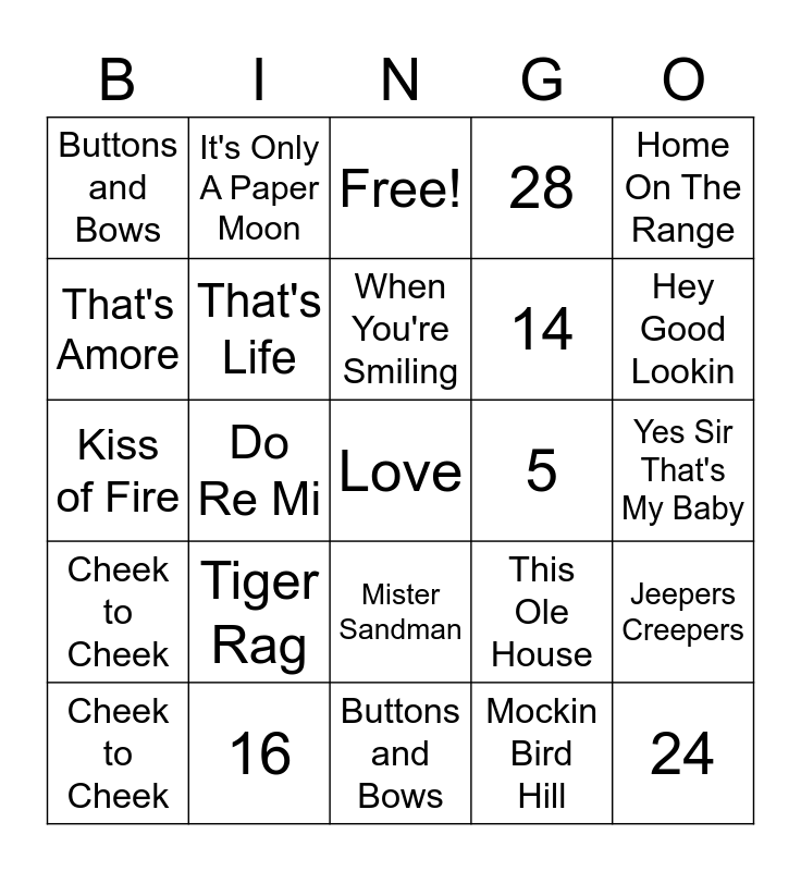 ⚠ This card has duplicate items: A Bushel and A Peck (2), Adios Muchachos (2), Ain't She Sweet (2), Ain't That A Kick In The Head (2), All of me (2), Always (2), April Showers (2), As Time Goes By (2), At Last (2), At The Hop (2), Baby Face (2), Buttons and Bows (2), Candy Lips (2), Cheek to Cheek (2), Come Fly With Me (2), Danny Boy (2), Deep Purple (2), Do Re Mi (2), Fly Me To The Moon (2), Getting To Know You (2), Hello Dolly (2), Hey Good Lookin (2), High Hopes (2), Home On The Range (2), Honey (2), I Did It My Way (2), I Got Rhythm (2), I Love You Truly (2), I'd've Baked A Cake (2), If I Were A Rich Man (2), If You Knew Susie (2), It Had To Be You (2), It's Only A Paper Moon (2), Jeepers Creepers (2), Kiss of Fire (2), Love (2), Mairzy Doats (2), Matchmaker (2), Mister Sandman (2), Misty (2), Mockin Bird Hill (2), Moon River (2), Moonlight Bay (2), Move It On Over (2), My Blue Heaven (2), My Way (2), On Top Of Old Smokey (2), Over The Rainbow (2), Pennies From Heaven (2), Pistol Packin Mama (2), Polly Wolly Doodle (2), Red Red Robin (2), Route 66 (2), Sentimental Journey (2), Seventy Six Trombones (2), Show Me (2), Sioux City Sue (2), Standing On The Corner (2), Sweet Georgia Brown (2), Tangerine (2), Tea For Two (2), That's Amore (2), That's Life (2), That's My Girl (2), The Band Played On (2), The Candy Man (2), The Pink Panther (2), The White Cliffs of Dover (2), This Ole House (2), Three little Fishes (2), Tiger Rag (2), We'll Meet Again (2), When You're Smiling (2), Yes Sir That's My Baby (2), Zip-A-Dee-Doo-Dah (2)