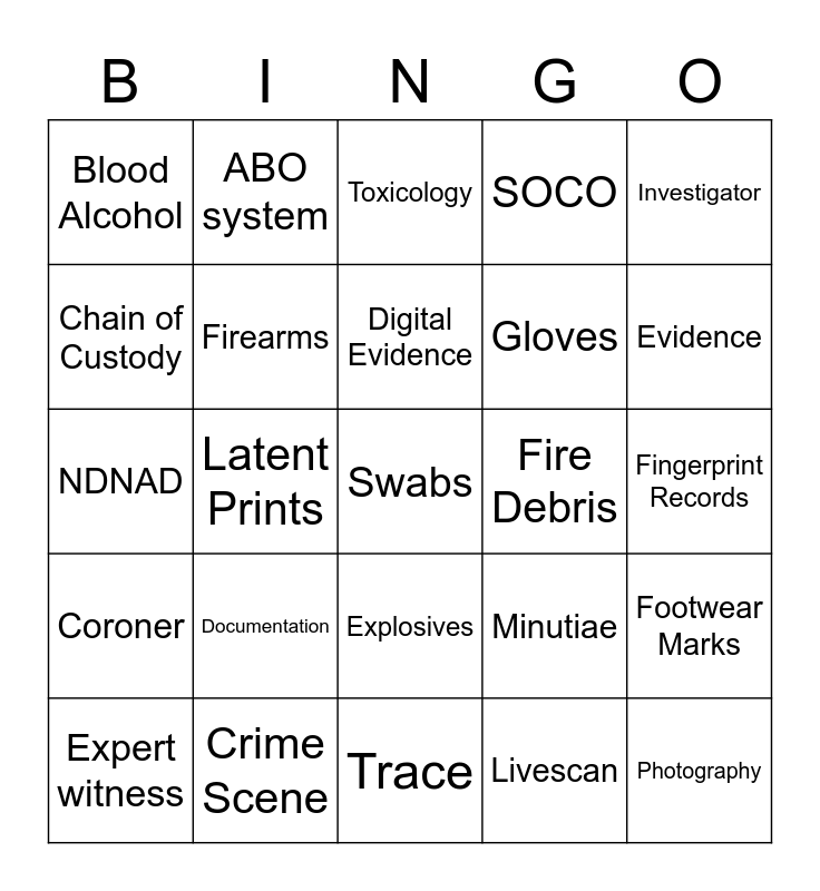 This bingo card has 30 words: Crime Scene, DNA, Latent Prints, Drugs, Blood Alcohol, Toxicology, Firearms, Explosives, Fire Debris, Trace, Fingerprint Records, Swabs, Livescan, Photography, Evidence, Tamper Evident Seal, Minutiae, Coroner, Documentation, Investigator, NDNAD, CODIS, ABO system, Gloves, Chain of Custody, SOCO, Footwear Marks, Expert witness, Digital Evidence and Testimony.