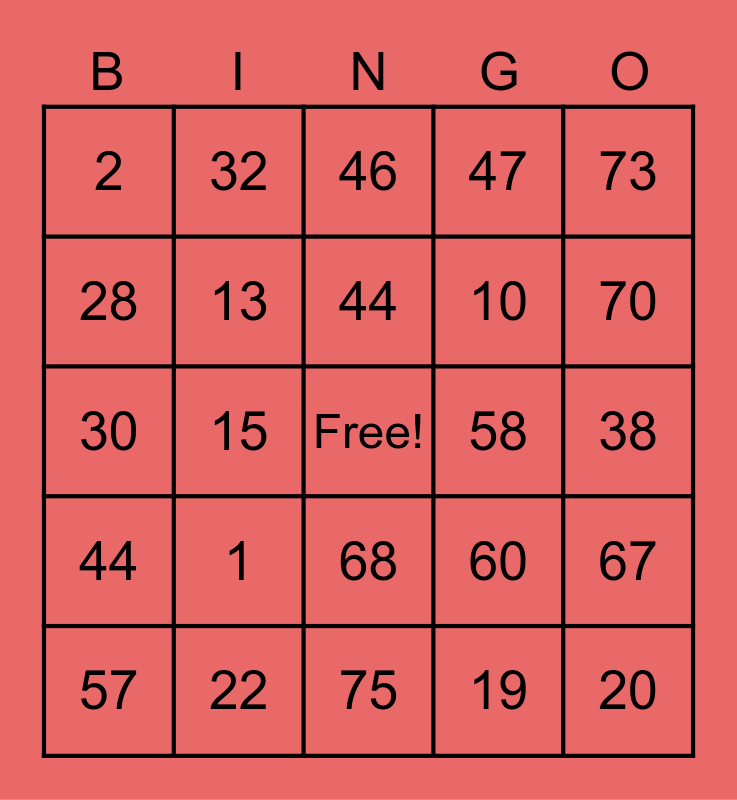 This bingo card has a free space and 24 words: 1, 22, 44, 57, 73, 2, 28, 32, 58, 68, 10, 30, 60, 67, 13, 19, 38, 46, 70, 15, 20, 44, 47 and 75.