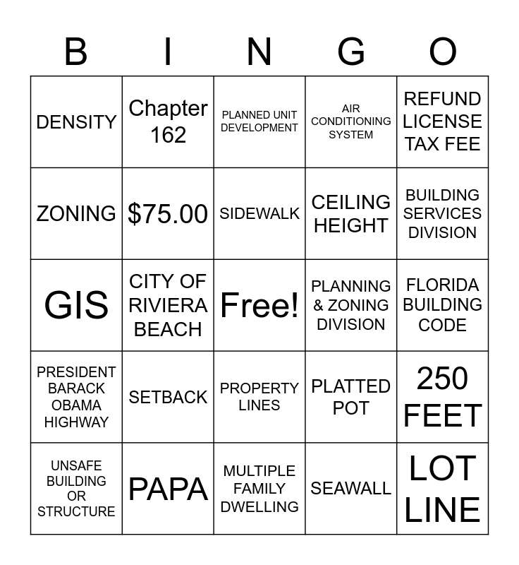 This bingo card has a free space and 33 words: 42 STORIES, RIVIERA BEACH, CITY OF RIVIERA BEACH, OAK LAWN, PRESIDENT BARACK OBAMA HIGHWAY, $75.00, REFUND LICENSE TAX FEE, UNSAFE BUILDING OR STRUCTURE, Chapter 162, BUILDING OFFICIAL, SIDEWALK, PLANNED UNIT DEVELOPMENT, PARCEL OR PROPERTY CONTROL NUMBER, FORECLOSURE, PLANNING & ZONING DIVISION, BUILDING SERVICES DIVISION, PAPA, GIS, SETBACK, PLATTED POT, PROPERTY LINES, DWELLING, DUPLEX, DENSITY, FLORIDA BUILDING CODE, MULTIPLE FAMILY DWELLING, LOT LINE, AIR CONDITIONING SYSTEM, CEILING HEIGHT, ZONING, 250 FEET, POOL SAFETY BARRIER, SEAWALL and MISSION STATEMENT.