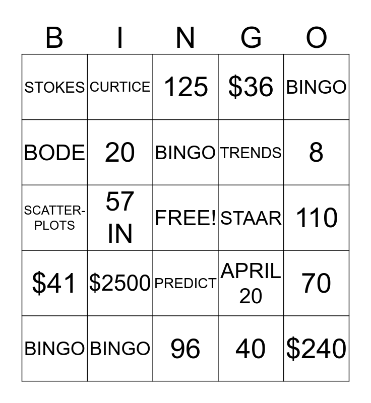 This bingo card has a free space and 24 words: $2500, BINGO, BINGO, BINGO, BINGO, STOKES, BODE, CURTICE, STAAR, PREDICT, TRENDS, SCATTER-PLOTS, APRIL 20, 70, 20, 40, 110, 125, 8, 57 IN, $240, $41, $36 and 96.