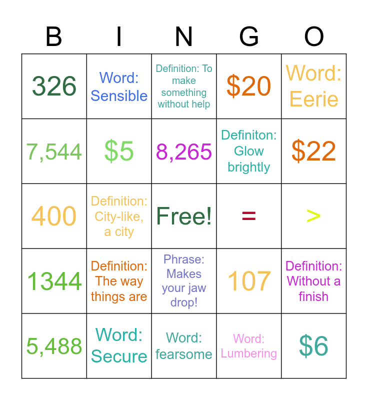 This bingo card has a free space and 24 words: Definition: The way things are, Word: Secure, 8,265, 5,488, Word: Eerie, 326, 7,544, Word: Sensible, =, Phrase: Makes your jaw drop!, Definiton: Glow brightly, 400, 107, Definition: Without a finish, $5, Word: Lumbering, >, Definition: To make something without help, $22, Definition: City-like, a city, $6, 1344, $20 and Word: fearsome.