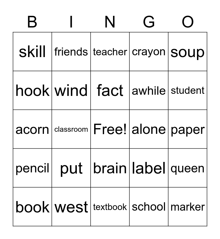 This bingo card has a free space and 24 words: put, west, fact, book, soup, skill, hook, friends, alone, brain, awhile, acorn, label, queen, wind, school, paper, teacher, student, classroom, marker, pencil, crayon and textbook.