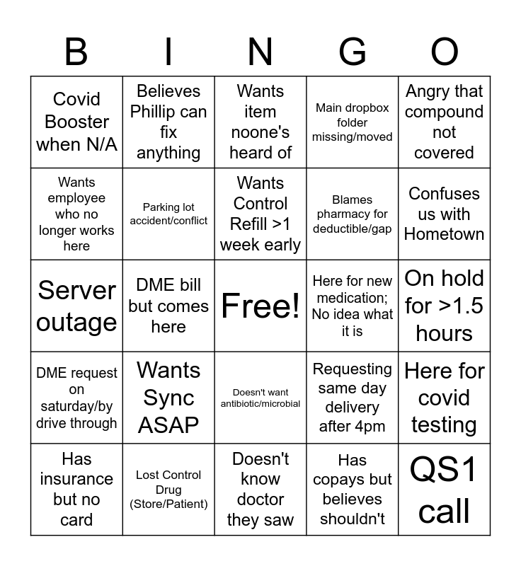 This bingo card has a free space and 24 words: Wants Sync ASAP, Lost Control Drug (Store/Patient), Wants Control Refill >1 week early, Has insurance but no card, Angry that compound not covered, Covid Booster when N/A, Wants employee who no longer works here, Believes Phillip can fix anything, Here for new medication; No idea what it is, Doesn't want antibiotic/microbial, Blames pharmacy for deductible/gap, Server outage, Requesting same day delivery after 4pm, Here for covid testing, Parking lot accident/conflict, Has copays but believes shouldn't, On hold for >1.5 hours, Wants item noone's heard of, Confuses us with Hometown, DME bill but comes here, QS1 call, DME request on saturday/by drive through, Main dropbox folder missing/moved and Doesn't know doctor they saw.
